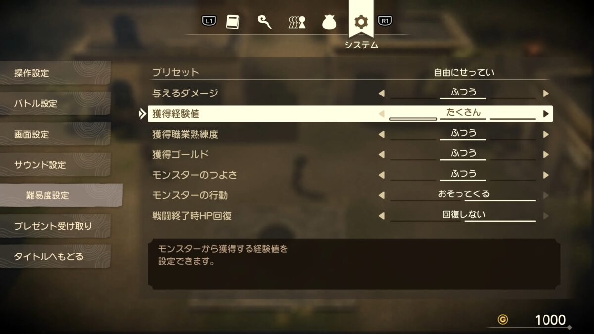 - 難易度カスタム:「楽ちんプレイ」から「いばらの道だぜ」までのプリセットに加え、「自由にせってい」では与えるダメージ、獲得経験値、獲得ゴールドなどを個別に調整可能。詰まった時だけ設定を緩めるといった遊び方も想定されています。