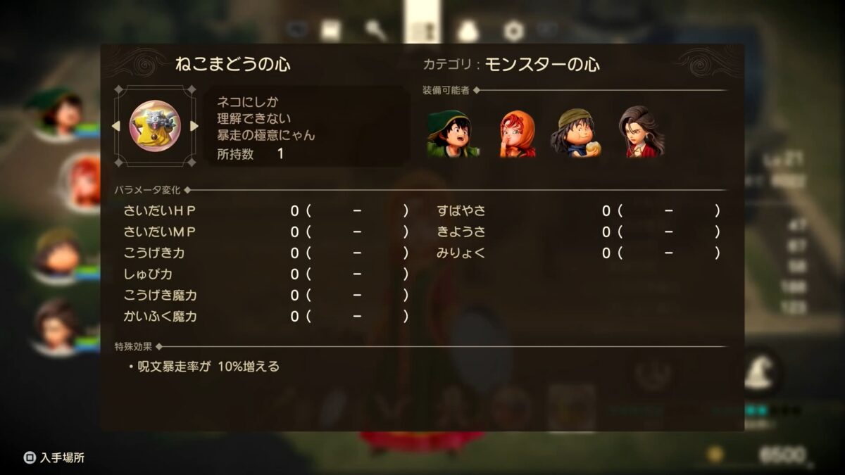 周囲の雑魚モンスターより格段に強い相手ですが、倒すと一度きりで復活せず、「モンスターのこころ」を確定でドロップします。モンスターのこころはアクセサリー枠(2つ装備可能)に装備するアイテムで、ステータス上昇や特殊効果を得られます。