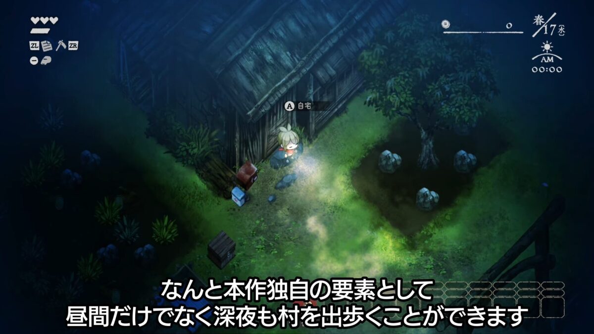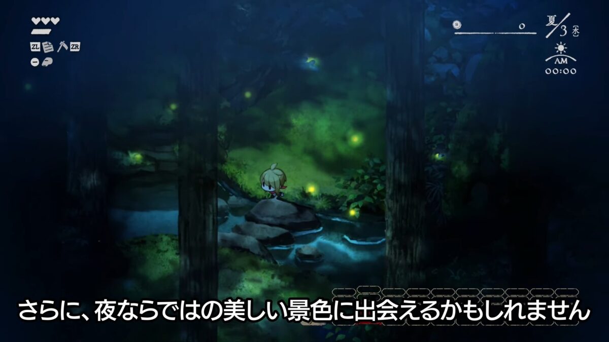 注目すべきは、生活シミュレーションゲームでは珍しい深夜の村探索要素です。昼間の生活に役立つ素材の収集やホタルの群れとの出会いなど、夜ならではの美しい体験が楽しめます。一方で、最新映像ではホラー要素を示唆する一場面も確認されており、『夜廻』スタッフが手がける作品ならではの不穏な雰囲気も含まれています。本作の対象年齢は15歳以上相当とされています。