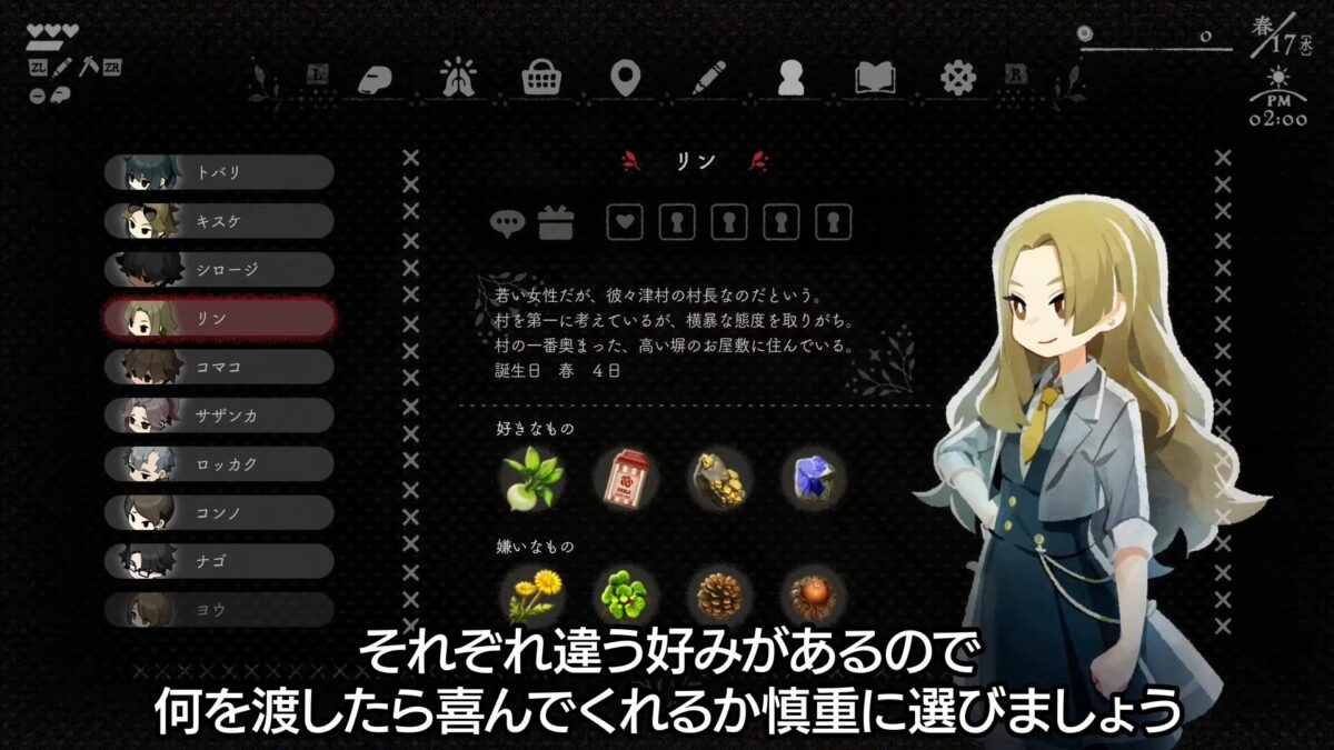 村の住民にはプレゼントを贈ることができ、それぞれの好みに合わせた品物を選ぶ必要があります。好感度を上げることで特別なイベントが発生する仕組みです。