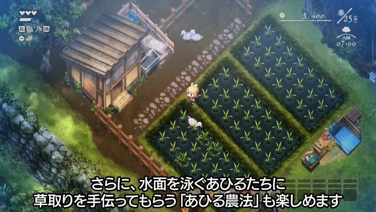 「日本一ソフトウェア UNTITLED// Lite 2025.9.19」の紹介では、畑作に加えて水田での農業要素が詳しく紹介されました。プレイヤーは田起こしから水田を整備し、お米やレンコンなどの水辺特有の作物を育てることができます。特徴的なのは「あひる農法」と呼ばれるシステムで、水田を泳ぐあひるたちが草取りを手伝ってくれる仕組みが用意されています。