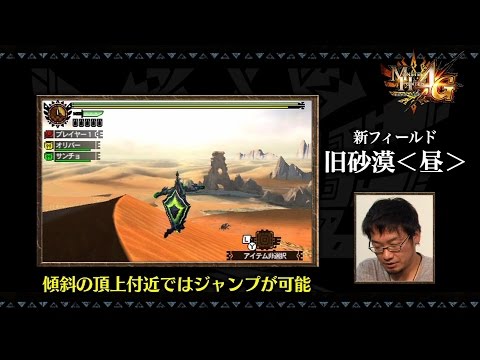 カプコンは10月11日に発売を予定している3DS用ソフト『モンスターハンター4G』のポイントを、藤岡要ディレクターと辻本良三プロデューサーが紹介するシリーズ動画「いざ、G級の冒険へ!」の第2回が公開されました。今回は、シリーズ1作目からの復活となる「砂漠<昼>」がじっくりと紹介されます。
