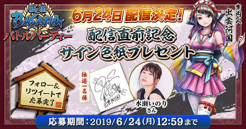 カプコンはiOS/Android用ゲームアプリ『戦国BASARA バトルパーティ』の配信日を6月24日に決定しました。配信に向けて、案内人“出雲阿国役”の声優・水瀬いのりさんのサイン色紙が当たるものや、毎日6名にAmazonギフト券1万円分が当たるキャンペーンが実施中です。