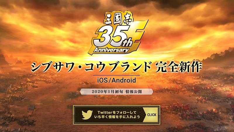 コーエーテクモゲームスは、歴史SLG『三國志』シリーズの35周年記念タイトルとして、シブサワ・コウブランドによるiOS/Android向け完全新作タイトルを開発中であると発表しました。2020年1月初旬に情報が公開されます。