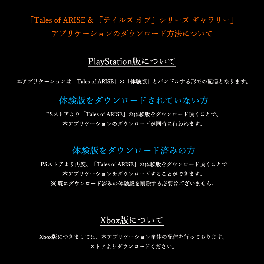「Tales of ARISE & 『テイルズ オブ』シリーズ ギャラリー」PS/Xboxストアにて配信開始 X Bluesky はてブ コピー 2022.02.01バンダイナムコエンターテインメントは、PS/Xbox用アプリケーション「Tales of ARISE & 『テイルズ オブ』シリーズギャラリー」の配信を開始しました。本アプリでは、歴代『テイルズ オブ』シリーズのキャラクターデザインやパッケージアートなどを閲覧可能。ダウンロード方法は下記画像の通りです。