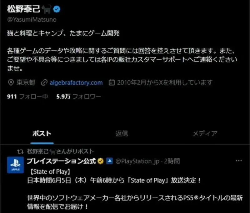 2025年6月初旬、松野泰己氏がX(旧Twitter)にて「State of Play」開催を知らせるPlayStation公式ポストをリツイートしました。ただし現在は取り消されています。