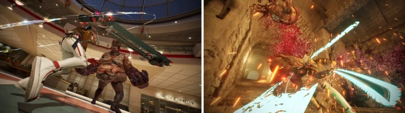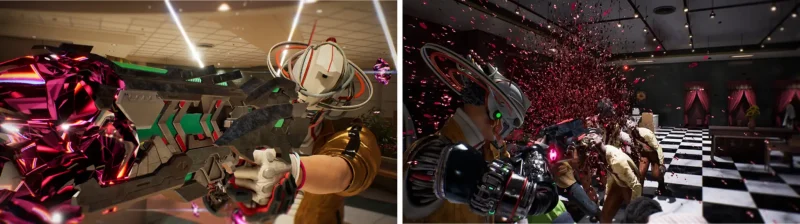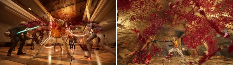 プレイヤーは、銃と剣を使い分ける「銃剣武器」を駆使し、敵を倒していきます。レベルデザインには頓知が利いており、爽快感あふれる「ブラッディアクション」が展開されます。また、敵から得た血を利用して発動する必殺技「ブラッディサマー」により、戦況を一変させることが可能です。