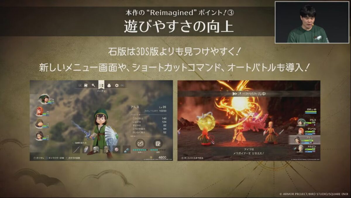 今回のリメイクでは、その魅力を維持しつつ、全体のテンポを上げ、より濃密なストーリー体験を提供することを目的としています。市川毅プロデューサーは、シリーズの生みの親である堀井雄二氏と相談の上、物語の本筋との関わりが比較的薄い部分を整理する判断に至ったと説明しています。