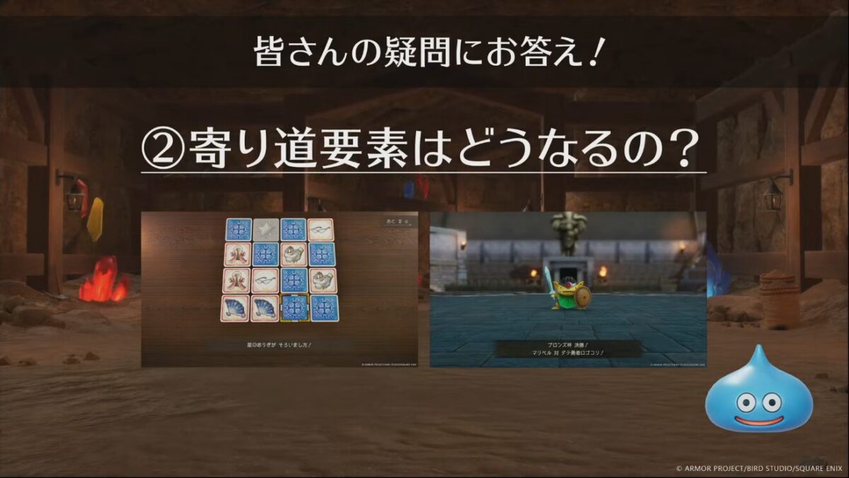 ただし、カジノ内のミニゲームだった「ラッキーパネル」は、新たな形で楽しめるよう調整して収録されます。そして、完全新規のやりこみ要素として「闘技場」が追加されます。闘技場では、勝ち進むことで豪華な景品が手に入るほか、エンドコンテンツとして歴代シリーズのボスといった強敵と戦えることも堀井氏から語られました。