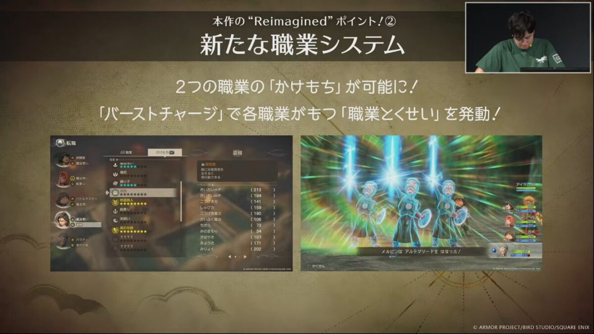 オリジナル版の「モンスター職」は廃止されますが、転職に必要だったアイテム「モンスターのこころ」は、キャラクターが装備できるアクセサリーとして登場します。バトル中には、職業特性を発動できる新要素「バーストチャージ」が導入され、戦略の幅が広がります。