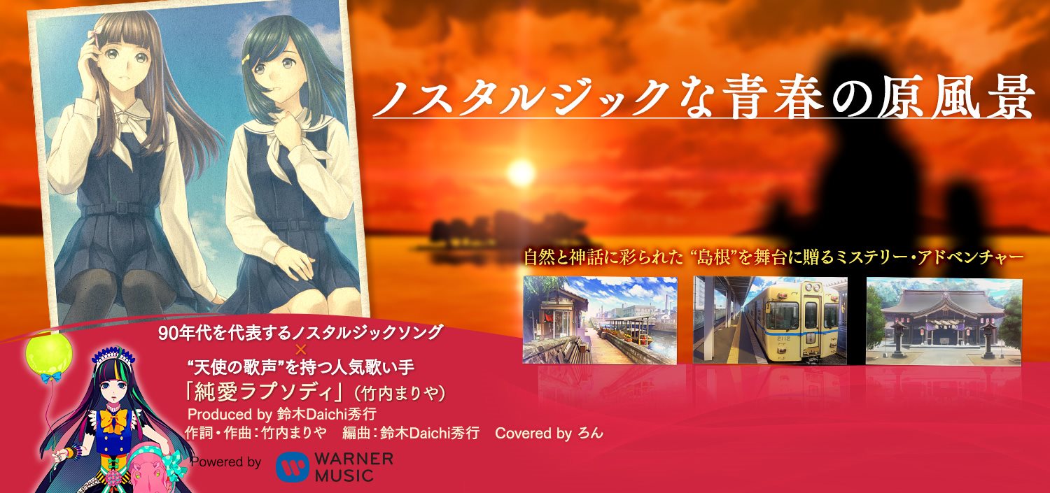 本作は、同社が新たに立ち上げた“角川ミステリーアドベンチャー”シリーズの第1弾となる作品で、島根県を舞台にした青春ミステリーアドベンチャー。対応ハードはPS4/PS Vitaで2016年春の発売が予定されています。企画・キャラクターデザインは、『ラブプラス』や『イグジストアーカイヴ』などのキャラクターデザインを手掛けた箕星太朗氏です。