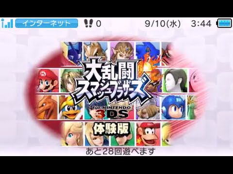 『スマブラ3DS』体験版が配信開始!マリオ、リンク、ピカチュウ、むらびと、ロックマンで遊べる! X Bluesky はてブ コピー 2014.09.10ニンテンドーeショップにて『大乱闘スマッシュブラザーズ for 3DS』の体験版が配信開始されました。体験版では、マリオ、リンク、ピカチュウ、むらびと、ロックマンを使って、「ひとりで大乱闘」ならびに「みんなで大乱闘」を楽しむことが可能です。必要ブロック数は1016ブロック、起動できる回数は30回です。この動画を YouTube で視聴
