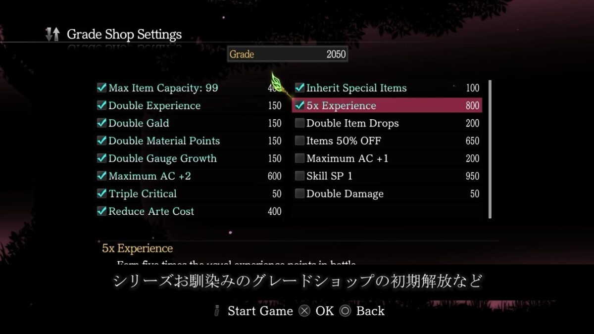 ・1周目から利用可能、開始時に5000GRADE所持。